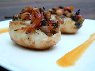 Ingrédients pour 2 personnes : 4 ou 6 casserons (selon la taille), 1/2 poivron rouge, 1/2 poivron vert, 1/2 poivron jaune, 1 tomate, 2 gousses d'ail, 1 oignon, 1 petit bouquet de persil plat, 60g de poitrine fumée, 1 petit verre de vin blanc sec, 1 grand verre de fumet de poisson, 1 cuillère à café de farine, poivre, huile d'olive, 1 noisette de beurre, cure-dents en bois.