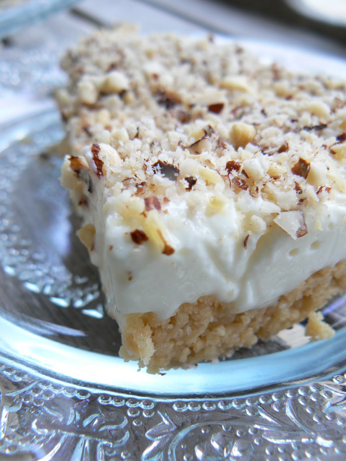 Ingrédients : 200g de biscuits Sprits, 80g de beurre demi-sel, 250g de mascarpone, 1 petite boîte de lait concentré sucré (397g), 20cl de crème semi-épaisse 20% de matière grasse, le jus et le zeste de 2 citrons, 70g de noisettes concassées ou 70g d'amandes effilées.