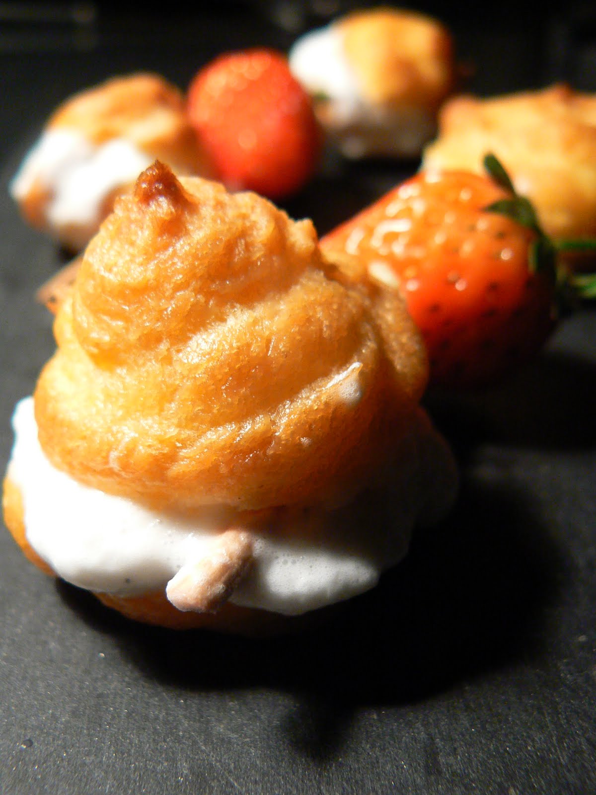 Montage : garnissez les coques de choux (coupés en deux au préalable) avec la crème et disposez en alternance sur des piques en bois avec les fraises. Vous pouvez rajouter de la crème par dessus ou saupoudrer de sucre glace.