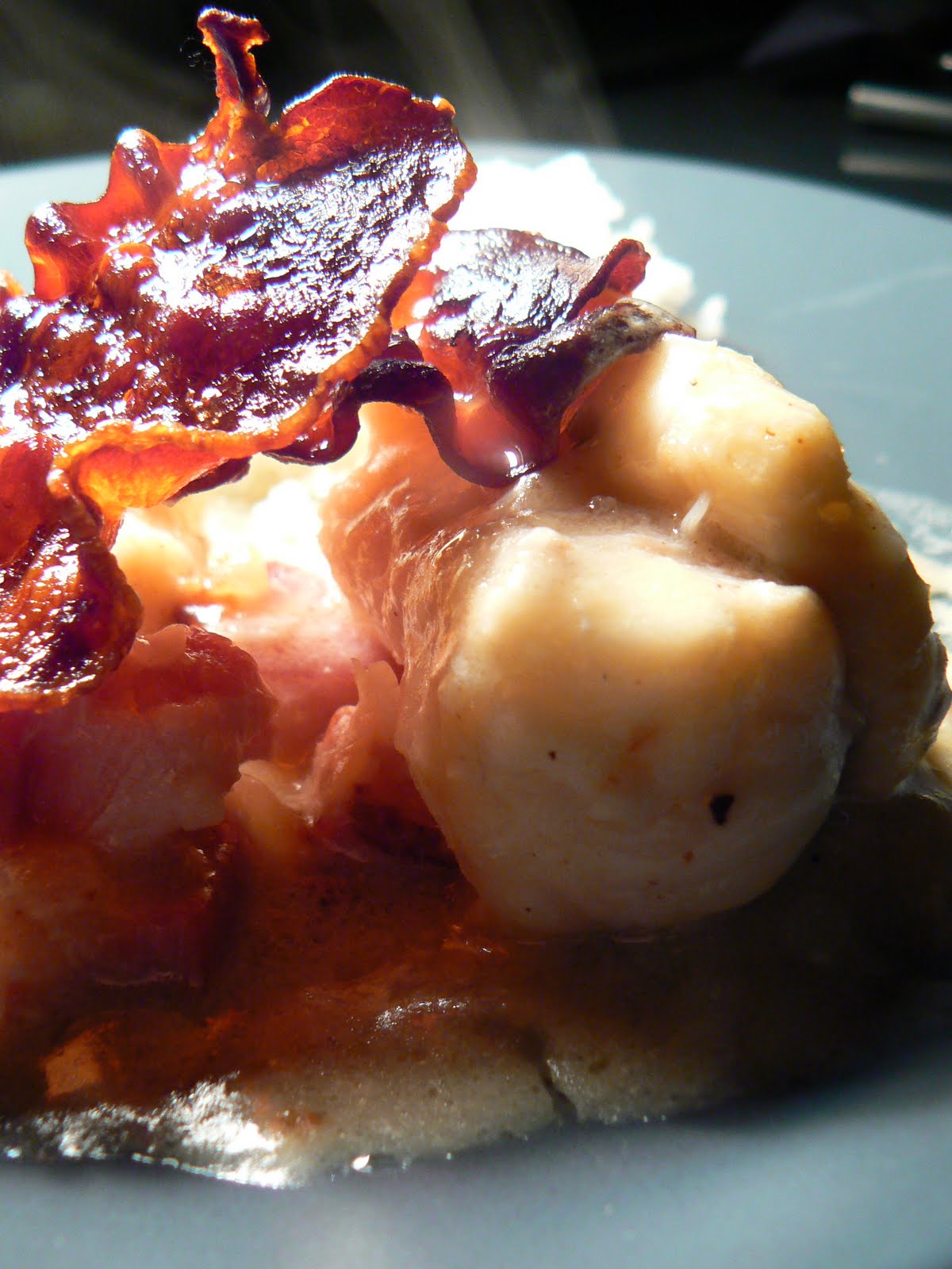 Pendant ce temps, disposez les tranches fines de poitrine sur la plaque du four sur une feuille de papier sulfurisé, et passez-les 5 minutes sous le grill du four à 200°C pour qu'elles se dessèchent et croustillent.