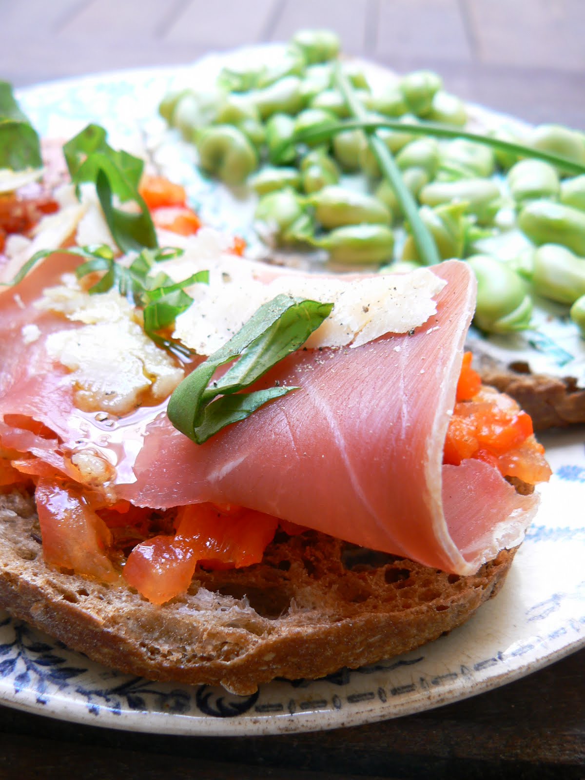 Ingrédients pour 2 personnes : 2 grandes tartines de pain aux graines, 2 tranches de jambon Serrano, 1 poivron rouge, 1 tomate, 1 gousse d'ail, huile d'olive, quelques copeaux de parmesan, 4 feuilles de basilic frais, fleur de sel, poivre du moulin.