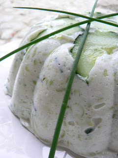 Mélangez le concombre, le fromage blanc, la gélatine fondue, l'oignon finement râpé, le jus de citron, l'ail écrasé, la ciboulette ciselée, le cumin, la coriandre et le poivre. Rectifiez l'assaisonnement en sel.