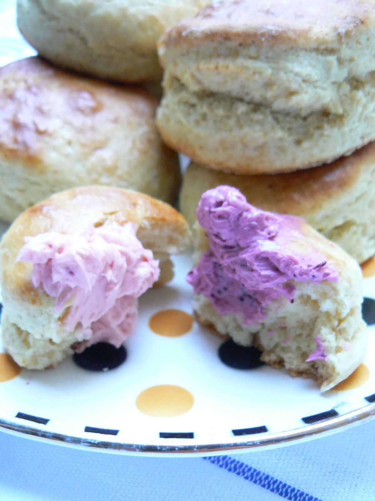 Fouettez le beurre mou jusqu'à ce qu'il blanchisse. Incorporez la confiture et fouettez jusqu'à ce que l'ensemble soit homogène. Servez avec les scones tièdes.