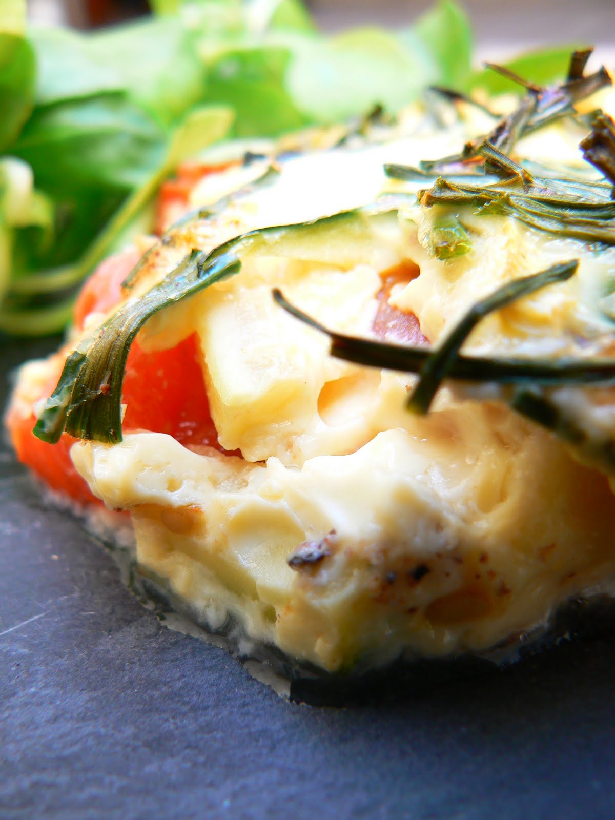 Ingrédients pour 4 personnes : 150g de petites courgettes, une douzaine de tomates cerises, 150g de chèvre frais (My Little Spoon a fait avec les moyens du bord, et a utilisé du chèvre demi-sec), 1 petit bouquet de ciboulette, 3 oeufs, 15cl de lait, 3 pincées de noix de muscade râpée, 3 pincées de cannelle en poudre, une noix de beurre, sel, poivre.