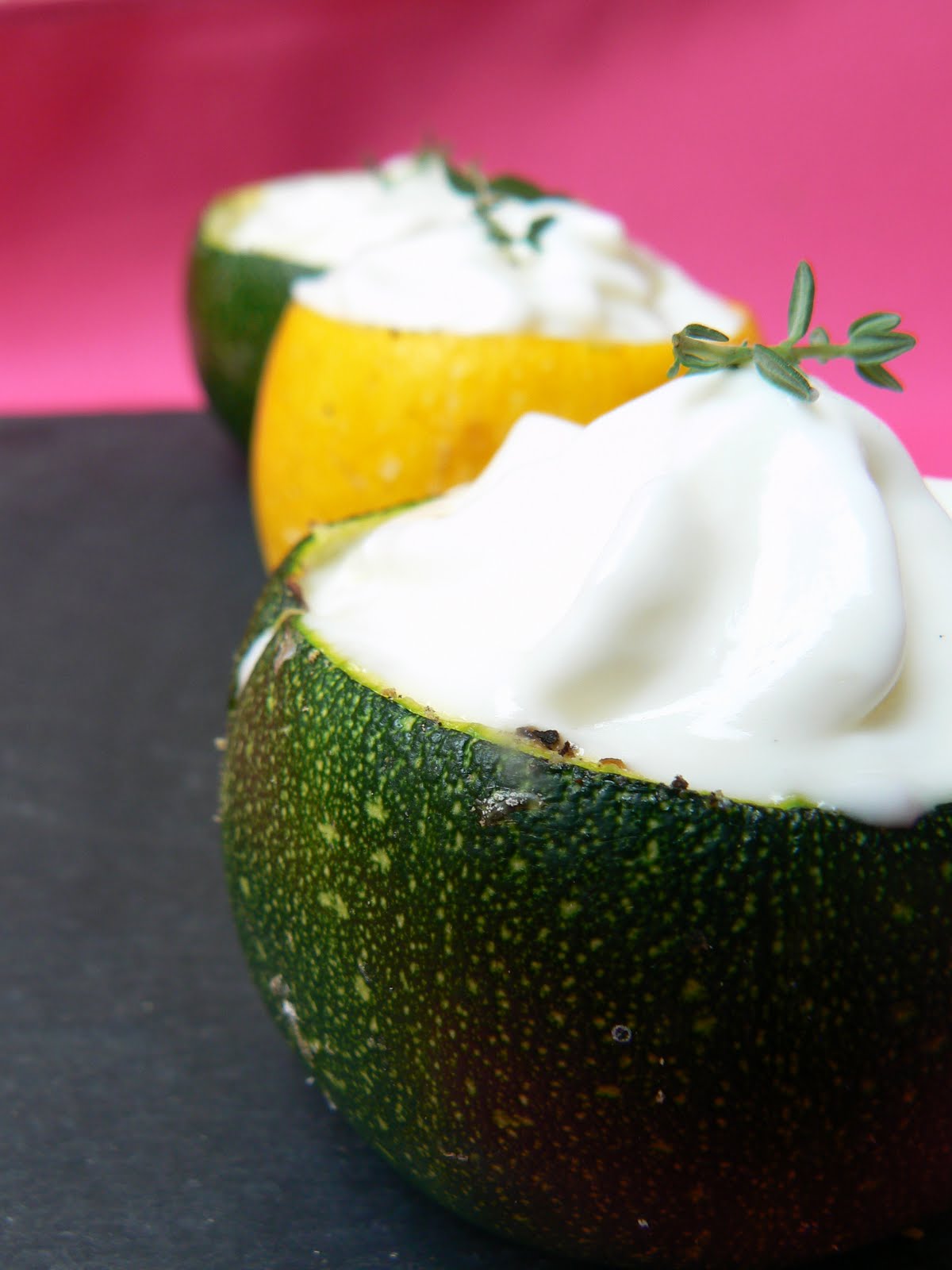 Ingrédients pour 4 personnes : 4 petites courgettes rondes vertes ou jaunes, 100g de chèvre frais, 20cl de crème liquide, 4 ou 5 tomates confites, 1 tomate fraîche (ou 2 petites), 1 gousse d'ail, 1 branche de thym frais.