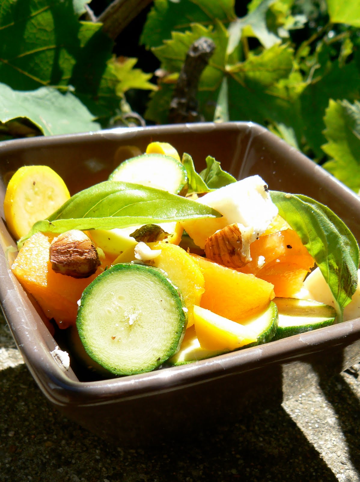 Ingrédients pour 6 personnes : une douzaine de mini-courgettes vertes et jaunes (ou à défaut 4 ou 5 petites courgettes vertes), 2 ou 3 abricots, une poignée de noisettes torréfiées, un morceau de chèvre sec, quelques feuilles de basilic frais, 2 cuillères à soupe d'huile d'olive, 1 cuillère à soupe de vinaigre de cidre, fleur de sel, poivre concassé.