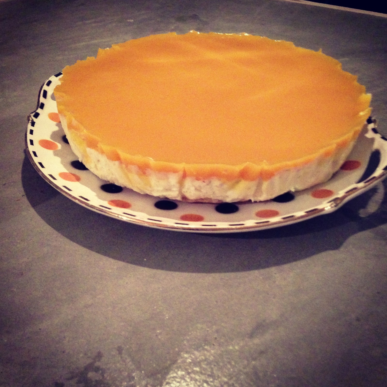 Une variante du Cheesecake pistache et gelée de framboise. On part sur la même base, mais on râpe un zeste de citron vert à la place des éclats de pistache, et on recouvre d'une gelée de mangue à base de gélatine.