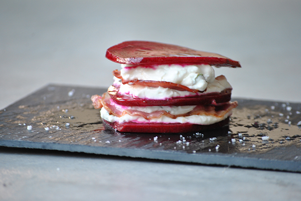 Réalisez les millefeuilles : disposez 4 assiettes individuelles. Avec un pinceau, badigeonnez le fond de chaque assiette avec un peu de vinaigrette (prise au fond du récipient de betterave). Disposez une rondelle de betterave, une couche de chèvre frais, une tranche de bacon, encore du chèvre frais, puis une autre rondelle de betterave et ainsi de suite, chèvre, bacon, chèvre, et terminez par une troisième et dernière rondelle de betterave.