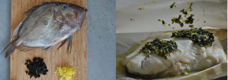préalablement salés et poivrés sur 4 carrés. Recouvrez chaque filet de 2 rondelles de beurre aromatisé.