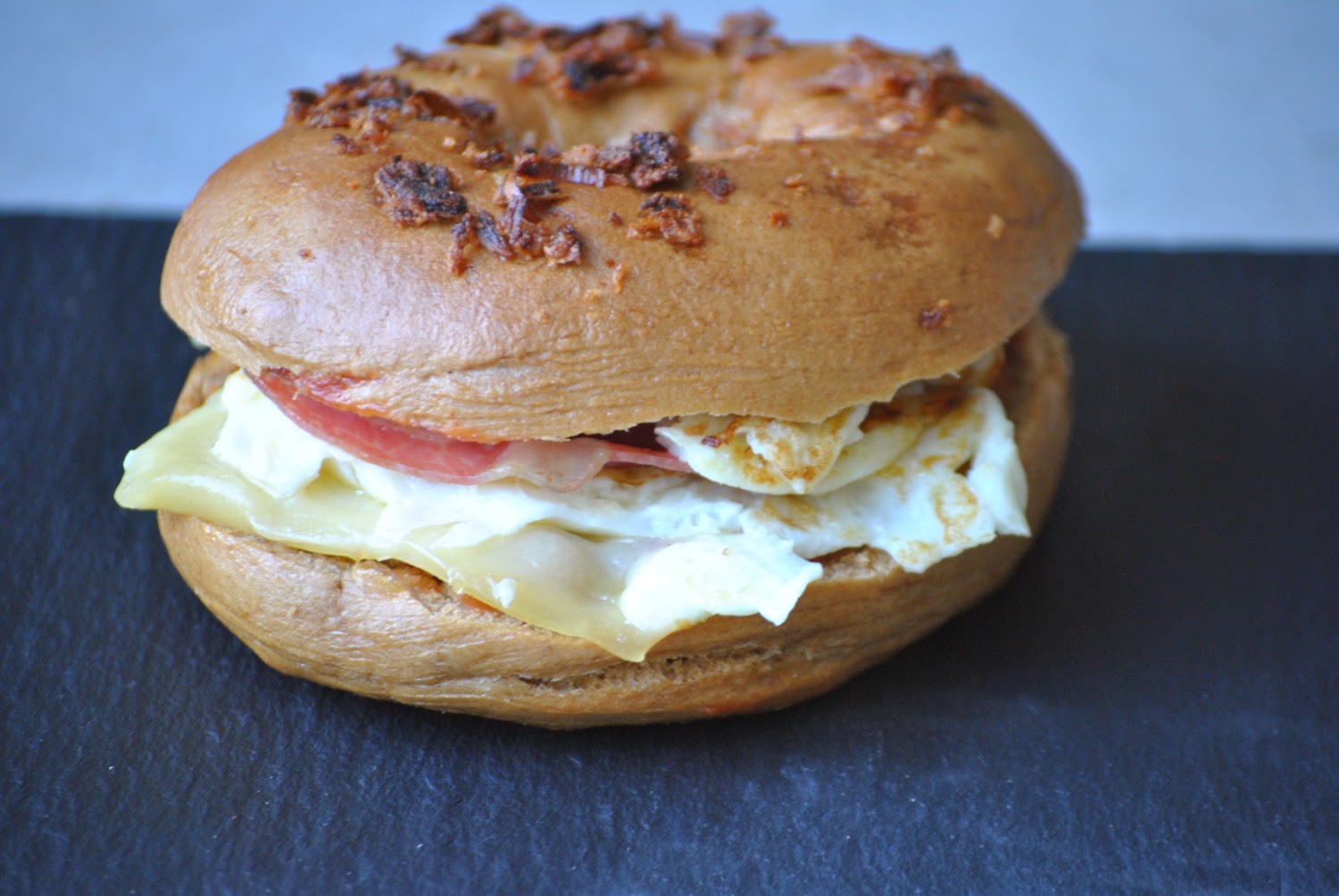 Version Eggbagel aux oignons frits, comté et pancetta