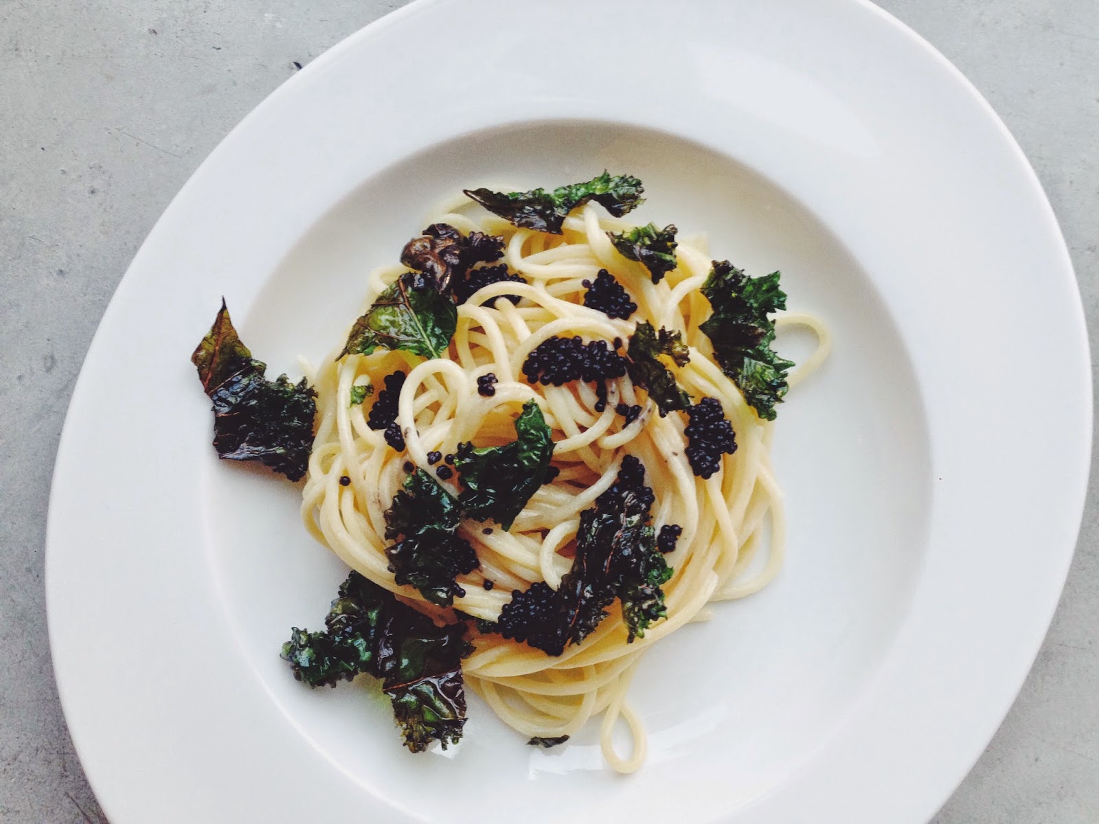 Epluchez les échalotes et ciselez-les. Faites-les revenir dans une poêle dans un peu d'huile d'olive. Versez la crème liquide, le jus de citron, portez à ébullition, salez et poivrez. Réservez. Faites cuire les spaghettis dans de l'eau bouillante salée. Une minute avant la fin de la cuisson, rallumez sous la poêle, versez une louche d'eau de cuisson dans la poêle, égouttez les spaghettis, versez-les dans la poêle. Eteignez le feu, puis rajoutez les oeufs de lompe très délicatement en faisant attention à ce qu'ils n'éclatent pas. Répartissez dans 4 assiettes creuses, puis répartissez les chips de kale par dessus. Vous pouvez rajoutez un peu de parmesan râpé si le coeur vous en dit.