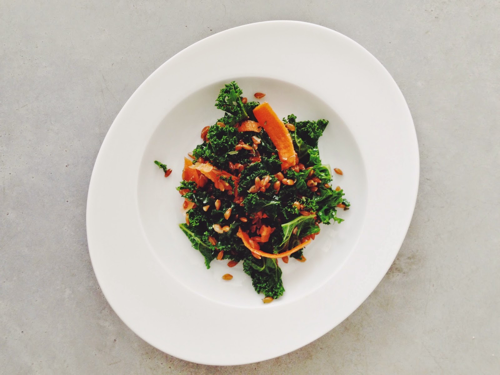 Salade de kale, petit épeautre et carotte, vinaigrette à l'huile de noix