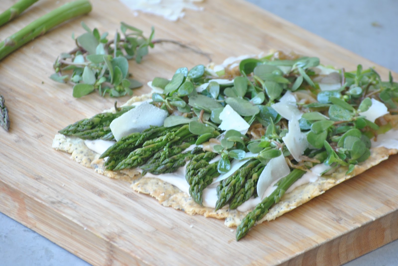 Une fois la pâte cuite au four, laissez tiédir 10 minutes, recouvrez de crème d'anchois. Disposez les asperges toutes dans le même sens, recouvrez de pourpier, d'oignons caramélisés, puis parsemez de copeaux de parmesan. Dégustez froid ou tiède.