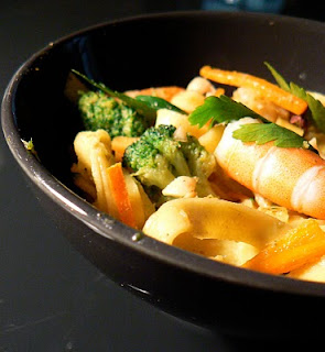Ingrédients pour 4 personnes : une vingtaine de grosses crevettes surgelées cuites, 350g de tagliatelles fraîches, 1 brocoli, 4 carottes, 50g de cacahuètes salées, 4 cuillères à soupe de gingembre râpé, 2 cuillères à soupe de pâte de curry vert, 1 cuillère à soupe de poudre tandoori, persil plat, poivre de Sichuan, sel, huile d'arachide.